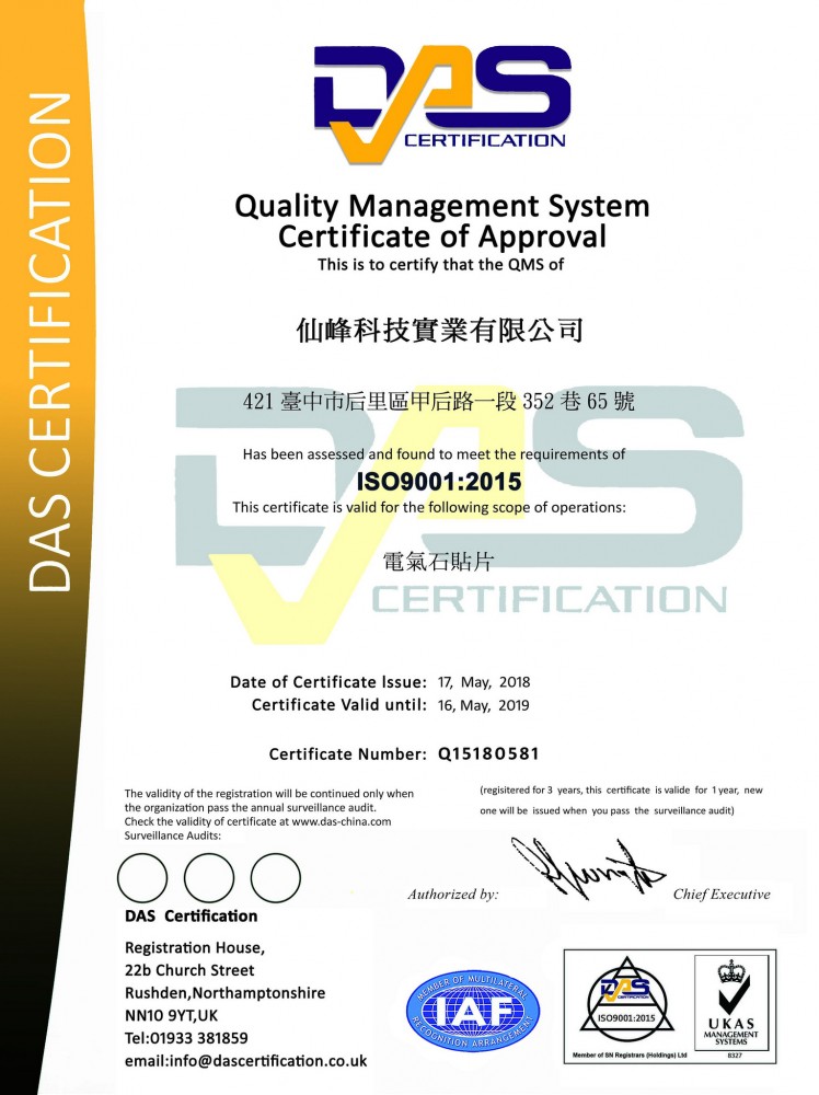 仙峰科技 通過ISO 9001:2015 國際認證